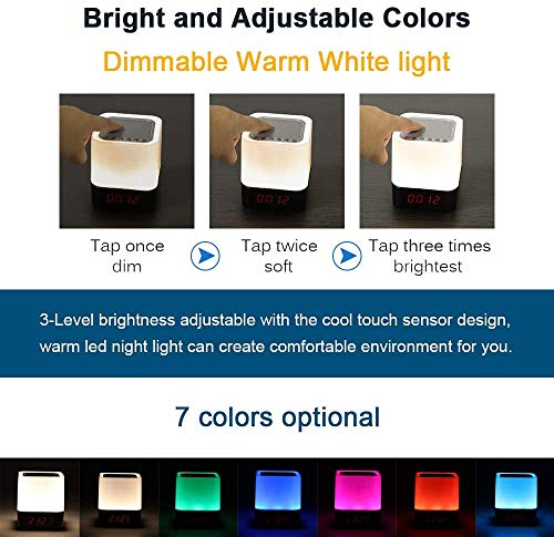 Bluetooth Speaker 5 in 1 Nachtlampje, Touch Sensor Nachtlampje Warm Licht en 7 Kleur Veranderende Wekker, MP3-speler…