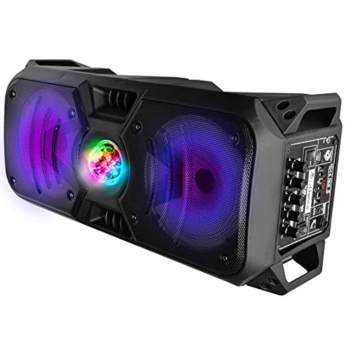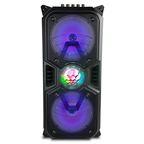 200 Watt Max 2 x 6,5 inch Woofer System Gemakkelijk 3,48 kg gemakkelijk te verplaatsen. RGB Disco heeft ingebouwde verlichting in de Woofer MP3 USB afspelen Draadloze Bluetooth-afspeeltijd 4 uur speeltijd met oplaadbare batterij Aangedreven door Li-On-batterijen 2-bands equalizer 1 x draadloze microfoon met microfoonprioriteit Geïntegreerde mixer met microfoon/AUX-ingangen Ingangsspanning: AC100-240 V, 50/60 Hz Afmetingen: 23 0x200x515 mm